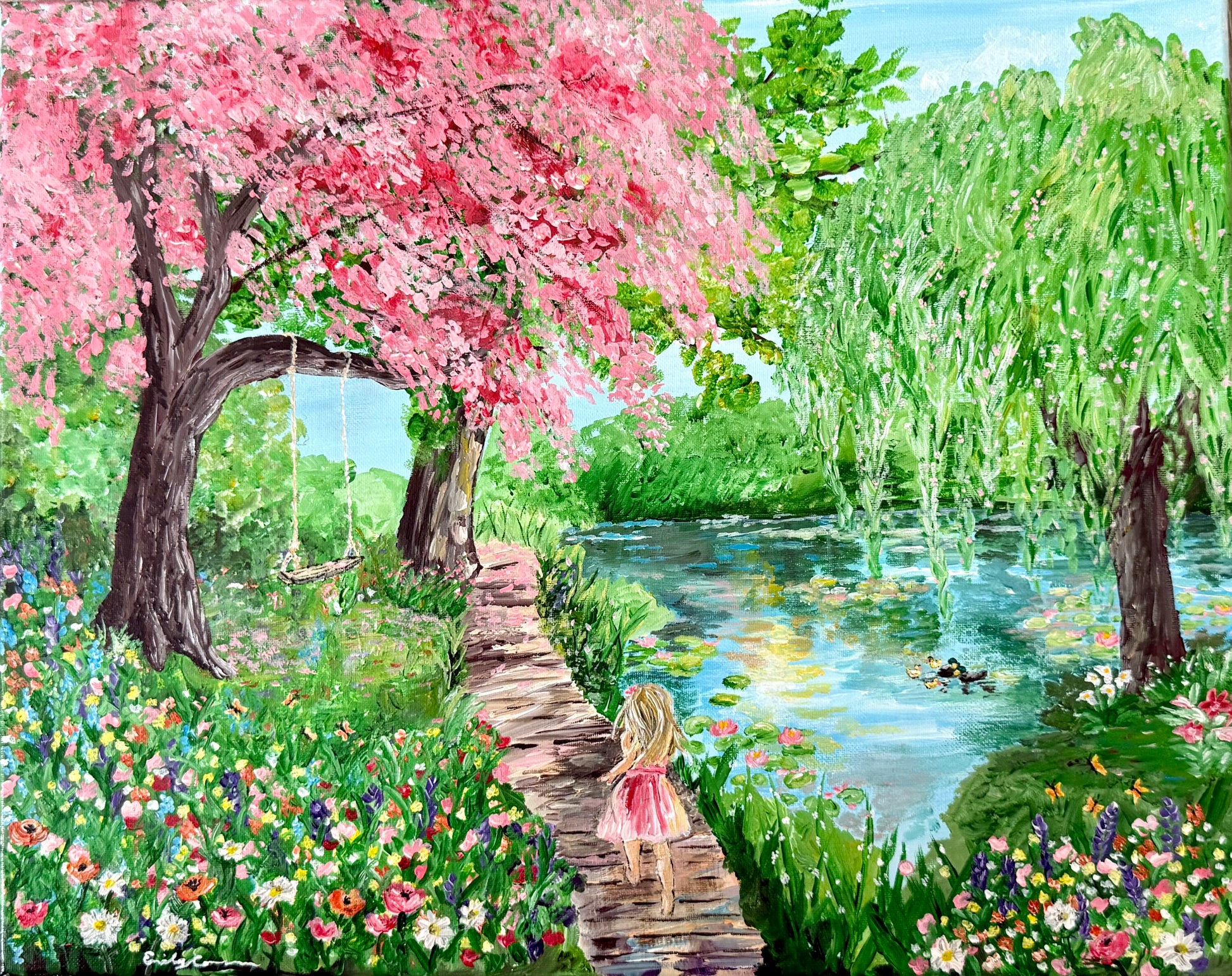 This original idea for this piece came from my 5 year old daughter Lilly. She requested a painting that was “like a fairy tale”, with her in a garden. She also specifically requested ducklings and butterflies. It was so fun bringing her idea to life. You’ll find lots of variations of Lilly flowers throughout the painting. As well as butterflies and ducklings, of course.